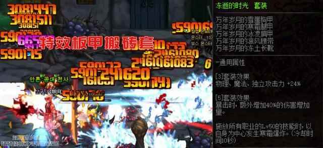 喜欢看手哥韩服视频的玩家肯定会看过这一个特效装备的视频,在五套哈林是十分防具装备中,重甲失落的宏图是一套非常有趣的特效装备,五件套拥有一个前冲攻击产出冲击波特效,这个特效就如图片中的那样,是不是很熟悉的感觉,这个特效攻击的范围非常大,所以用来搬砖也是非常不错的。 但是大家要注意啦,必须是前冲攻击才会有这个冲击波,那么在这么多的职业中,大家应该知道使用这一套最舒服的职业必定是神枪手啦,滑铲不仅能唯一,还能有特效攻击,用来搬砖不仅速度快,还不需要放无色技能。 其次鬼剑士应该也不错,点个连突刺玩玩还是很秀的吧。 板甲:冻逝的时光