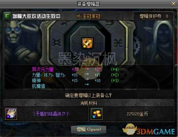 这里有两点大家一定要注意,这次增幅活动策划实际上玩了一个文字游戏,增幅6之前虽然确实不会掉级,但是会失败!!!增幅8之前虽然不会归零,但是会降级!!!这简直是个大坑,所以那些想要上个6或者上个8就收手的勇士们还是得且行且珍惜。