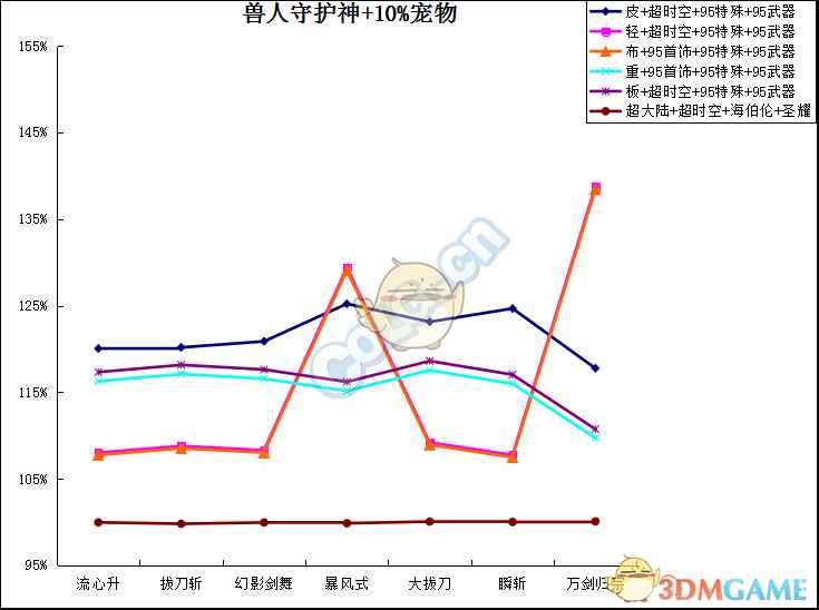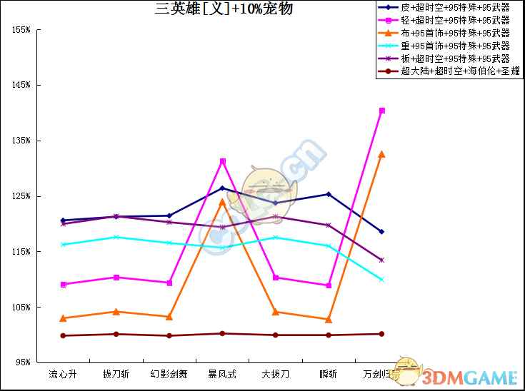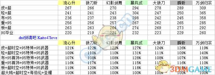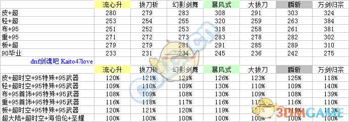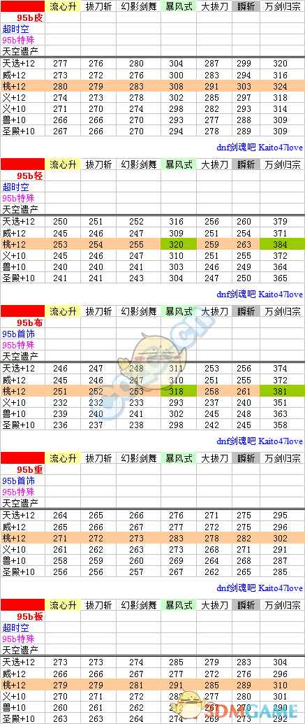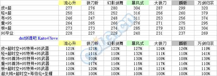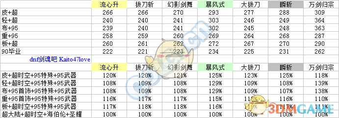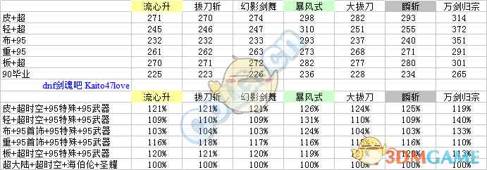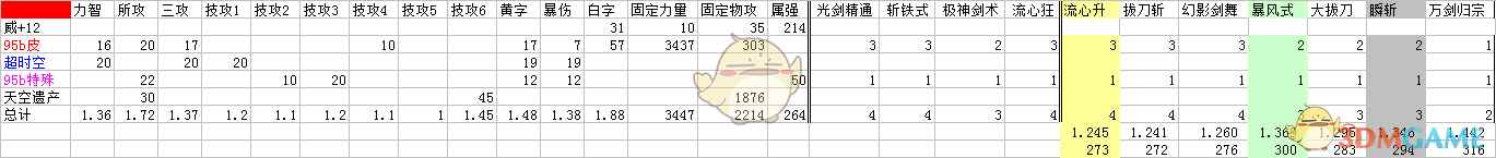 每列加算,至技能加成之前。 主动技能:取3级的百分比之商开三次方作为每级提升率。二觉除外,选择准确数值。 被动技能:选择准确数值,与95级契约基准做商。 流心升:受到流心狂加成,不受极神剑术加成伤害。 幻影剑舞:二觉被动单独计算合计。 分类寻找自己的定位。(虽然折线图没有意义,但是连上线不会让人找不准。) ① 天选搭配下: