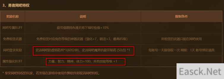 3、勇者网吧特权 勇者网吧说明文本 特权 1 燃烧疲劳值&通关地下城经验值+10% 特权 2 免费租赁武器,最高到Lv85 特权3 虚弱药剂*1(60分) 疲劳药(50点)*1 特权 4 属性强化BUFF (力量、智力、精神、体力+100、所有技能等级 +1)