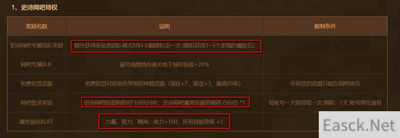 网吧特权内容详细介绍: 1、史诗网吧特权 史诗网吧说明文本 特权 1 额外获得安徒恩团队模式翻牌机会一次(专属) 特权 2燃烧疲劳值&通关地下城经验值+20% 特权 3 免费租赁武器,最高到Lv85 特权 4 虚弱药剂*1(60分) 疲劳药(50点)*1 特权5属性强化BUFF (力量、智力、精神、体力+100、所有技能等级 +1)