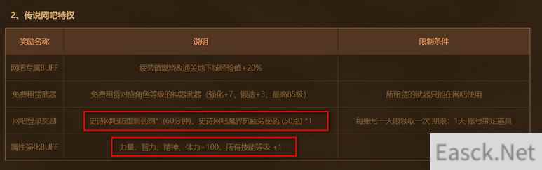 2、传说网吧特权 传说网吧说明文本 特权 1 燃烧疲劳值&通关地下城经验值+20% 特权2免费租赁武器,最高到Lv85 特权3 虚弱药剂*1(60分) 疲劳药(50点)*1 特权 4 属性强化BUFF (力量、智力、精神、体力+100、所有技能等级 +1)