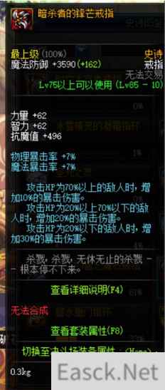 我们都知道艾肯套虽然很好,但是美中不足的是缺少黄爆,所以选择暗杀者的锋芒戒指正好弥补了这点不足,千万不要小看这件85级的史诗首饰,它的属性毫无逊色于90级的史诗戒指。 |
