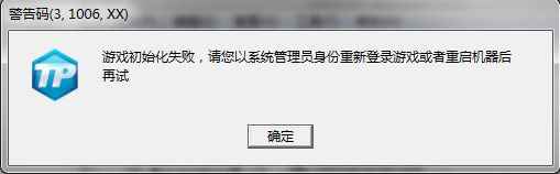 错误码:(3,1006,xx) 处理建议:游戏初始化失败,请您以系统管理员身份重新登录游戏或者重启机器后再试。 |