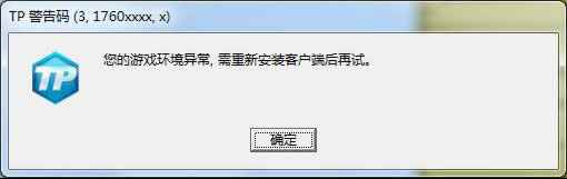 错误码:(3,1760xxxx,x),(3,1017,xx),(3,1023,xx) 处理建议:游戏环境异常,存在文件被篡改风险,请重新安装游戏。