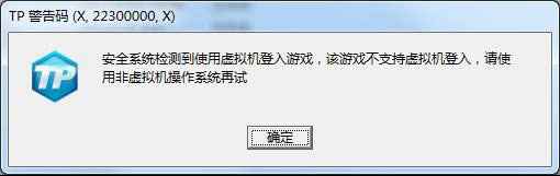 错误码:(x,22300000,x) ,(3,1013,xx),(3,1014,xx) 处理建议:安全系统检测到您在使用虚拟机登入游戏,该游戏不支持虚拟机登入,请使用非虚拟机操作系统登入该游戏。