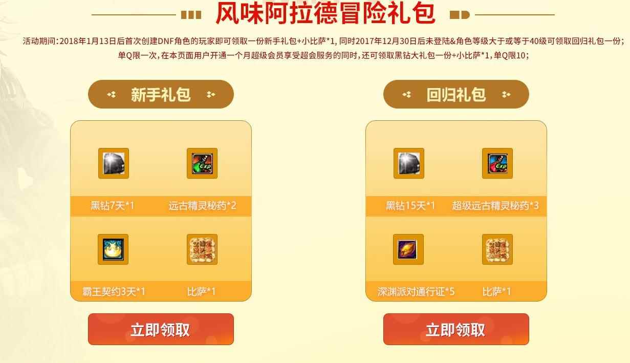 活动时间:12月30日——2月1日 DNF2018“热爱如一,风味不同活动”活动内容详情 活动地址:http://vip.qq.com/club/act/2018/2000252631/8b4481503f.html 风味阿拉德冒险礼包