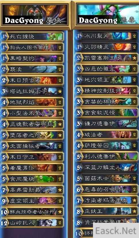 DacGyong是炉石传说亚服HCT赛事出现的大神之一,该选手为玩家带来很多不错的精品卡组,例如魔块、恶毒等等。那么这些卡组如何搭配呢?玩法是什么?下面就跟小编一起来看看吧。