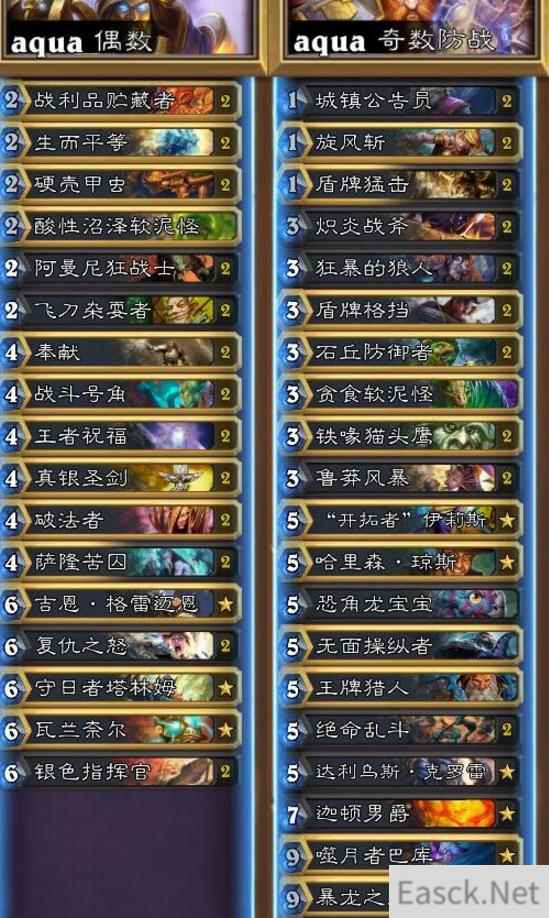 炉石传说亚服HCT赛事期间,有很多大神为玩家带来非常精彩的卡组,aqua正是当中之一,例如他带来奇数防战、恶毒、控制等卡组对玩家帮助很大。下面小编就将带来炉石传说亚服HCT第一赛季预选赛aqua卡组推荐,一起来看看吧。 亚服HCT第一赛季预选赛aqua卡组推荐