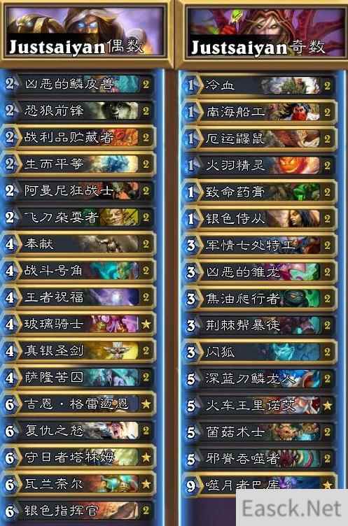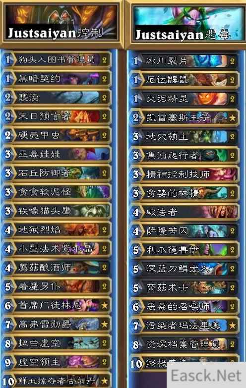 Justsaiyan是炉石传说实力非常优秀的一位选择,卡组搭配也有着自己的独特的想法。在美服HCT期间,该玩家带来很多有趣的卡组,例如恶毒、控制等等,下面就跟小编一起起来看看这些卡组的搭配吧。 美服HCT第一赛季预选赛Justsaiyan卡组推荐