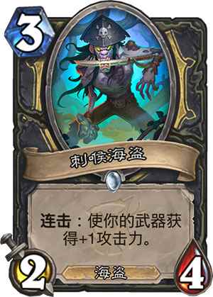 刺喉海盗,3费24身材,效果连击:使你的武器获得+1攻击力。身材亏爆,唯一的武器+1攻击力还需要连击触发,不好用。 |