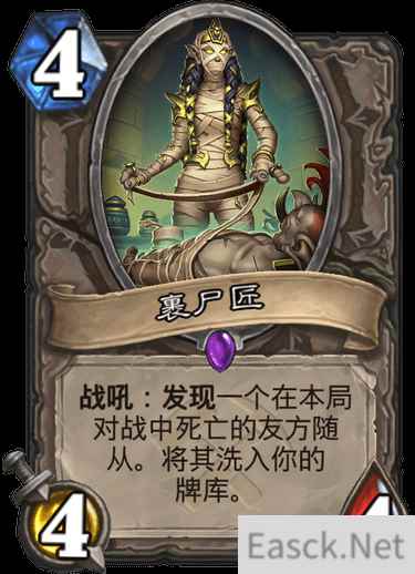 中立史诗随从,裹尸匠 战吼:发现一个在本局对战中死亡的友方随从。将其洗入你的牌库。 |