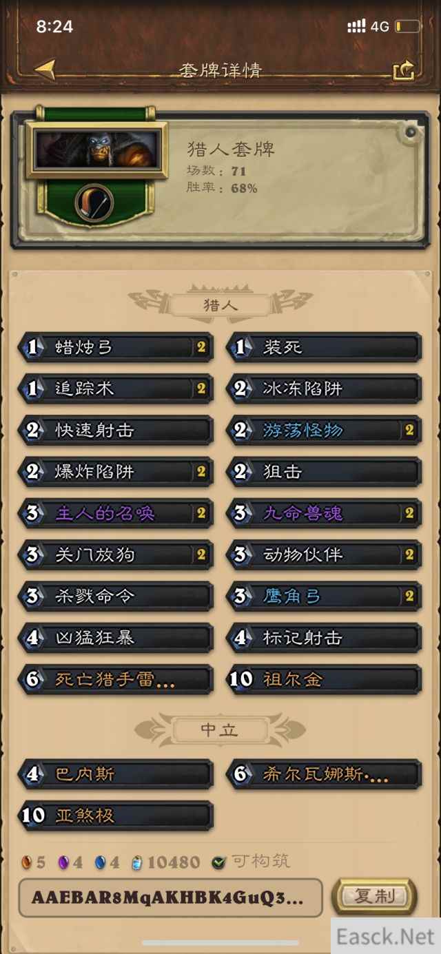 近期有网友晒出了自己68胜率的狂野女王猎卡组并成功打上传说,相信很多想要玩猎人的小伙伴都想跃跃欲试了,下面由小编为大家带来这套卡组的介绍。