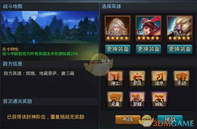 关卡特性 战斗中敌我双方所有英雄法术防御消减20% 敌方信息 敌方英雄:嫦娥、地藏菩萨、唐三藏 阵容搭配 这里我推荐用禺狨王突袭位,开局有嫦娥的沉默,禺狨王可以很好的避开,从后排高爆发秒掉嫦娥和唐三藏,剩下的地藏就简单了。 然后我方上场的2个英雄,建议用地藏+铁扇,撑过沉默,铁扇和地藏就可以回满状态了。多尝试几次就能过了。 关于经文选择:不动、净土、贪障、法华、虚无这些是必带的,其他的如果用了物理输出,就带罗汉。 打法技巧: 首先说这个关卡的3个英雄,嫦娥、地藏菩萨、唐三藏,纯法系的,而且还有地藏肉盾,嫦娥的沉默。针对法系英雄,我们可以搭配合适的经文,建议用贪障减对方的法术攻击。 再来是关卡特性,敌我双方法术防御减少20%,就是说,带了虚无,其实对自身也没多少用处。既然对方是减少了法防,可以考虑带法系输出。 |