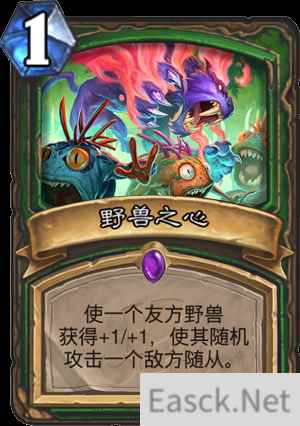 猎人紫卡:野兽之心。1费,使一个友方野兽获得+1/+1,使其随机攻击一个敌方随从。即使你的随从处于“冰冻”,“无法攻击”状态下依然可以攻击一次,优先使用这张卡牌攻击后的随从还可以正常攻击一次,刚刚入场也是可以攻击的!因为是随机,所以你“潜行状态下的动物之灵”并不是那么安全了。