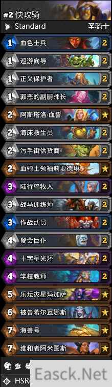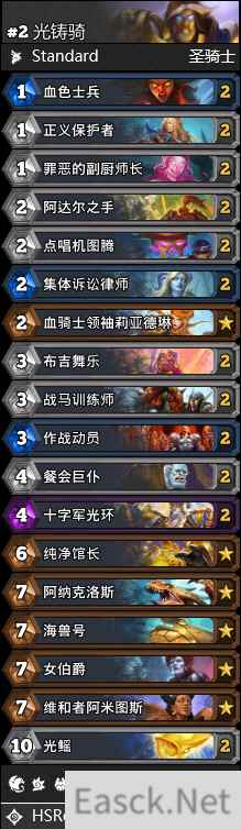 炉石传说泰坦诸神版本已经上线一段时间了,目前相冲天梯的话还是比较简单的,比如圣骑士,那么炉石传说泰坦诸神圣骑士卡组怎么搭配?下面就给大家带来炉石传说泰坦诸神圣骑士卡组推荐。 炉石传说泰坦诸神圣骑士卡组推荐光铸骑还是老样子,上传说绝对是效率最高的卡组,起手找牌:参会巨仆,点唱机图腾,十字军光环,副厨师长,阿达尔之手,布吉舞乐 补丁前外服开发出了一套快攻骑让人眼前一亮,在补丁后依然强势,绝对值得一玩,这套牌拥有比光铸骑更高的下限(但上限更低),传说以下强到无敌,传说以上强度迅速衰减,起手找牌:参会巨仆,副厨师长,作战动员,巡游向导,莉亚德琳,战马训练师