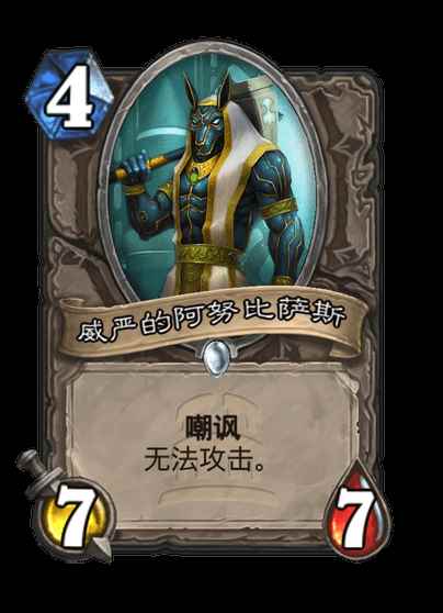 炉石传说新资料片泰坦诸神快上线了,这个资料片中会新增145张卡牌,而且带来了新的机制,比如威严的阿努比萨斯熙尔,那么炉石传说威严的阿努比萨斯怎么样?下面就给大家带来炉石传说威严的阿努比萨斯卡牌图鉴。 炉石传说威严的阿努比萨斯卡牌图鉴中立普通随从 威严的阿努比萨斯 4费7/7 嘲讽 无法攻击。