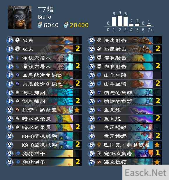 AAECAR8E5e8DwKwE57kEhskEDfT2A/f4A8X7A8OABLugBOGkBJ2wBO2xBIiyBOC5BIPIBL/TBLKeBQA= 好久没看到这个思路的T7猎了,新卡机械狗可以最大程度上发挥T7猎前期低费生物的优势,这个版本T7猎前期能抢血的最大杀手锏还是1费生物贴2费的狗狗饼干这个combo,现在机械狗也可以探底拉出1费随从,T7猎前期的攻势会更猛烈。盘牙蟠蟒既可以在站场之后锁住对手的关键牌来继续抢血,本身的身材也是很标准的,而且更巧妙的是它竟然还是个野兽可以被宠物收集者拉出来强行站场,这个combo让它上手或者在牌库里都能发挥很大的作用,加上巨型随从和它还有机会被鱼叉炮减费,可以说是卡组里上限最高的单卡了。 其他都是T7猎常规单卡,包括前期纳迦生物和纳迦的鱼群的配合以及一些直伤+巴拉克的组合弥补后期伤害。 « 1 2 3 4 5 6 »友情提示:支持键盘左右键"←""→"翻页 |
