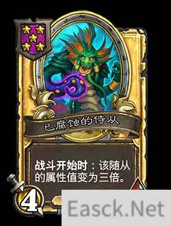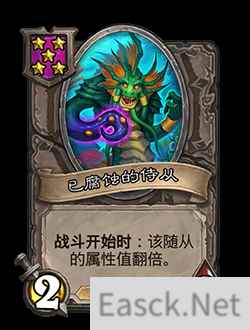 新随从已腐蚀的侍从已腐蚀的侍从 [酒馆等级5,纳迦]2点攻击力,2点生命值。战斗开始时:该随从的属性值翻倍。