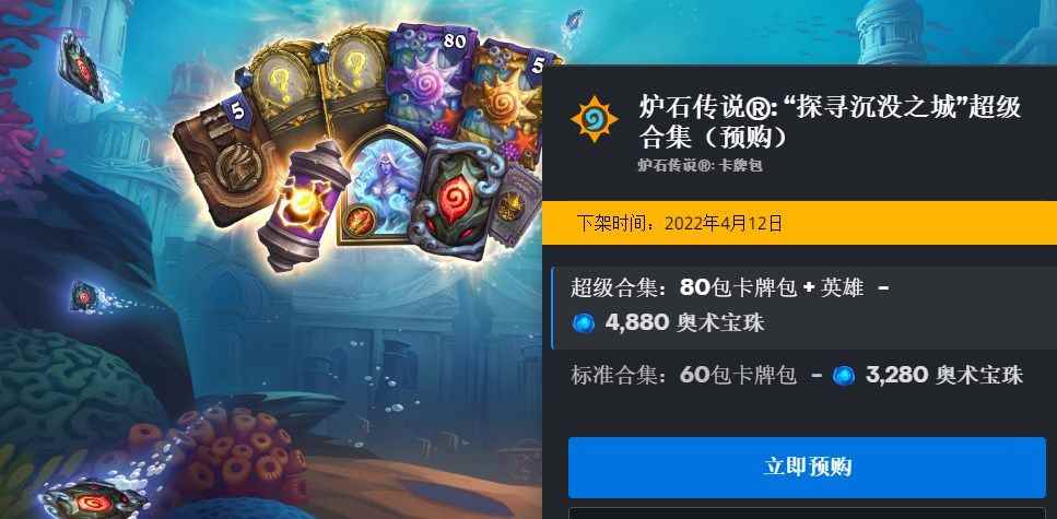 炉石传说探寻沉没之城拓展包预购价格汇总1、探寻沉没之城预购合集 “探寻沉没之城”超级合集(预购),售价:4880奥术宝珠,下架时间:2022年4月12日 “探寻沉没之城”标准合集(预购),售价:3280奥术宝珠,下架时间:2022年4月12日