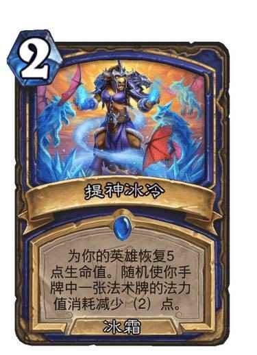 萨满稀有法术,2费 冰霜 为你的英雄恢复5点生命值。随机使你手牌中一张法术牌的法力值消耗减少(2)点。 |