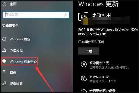 3、然后在弹出界面左侧点击【Windows安全中心】