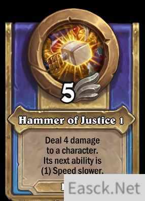 技能2:正义之锤(神圣) (1级)对一个角色造成4点伤害,其下一个技能的速度值减慢(1)点。 (2级)对一个角色造成7点伤害,其下一个技能的速度值减慢(2)点。 (3级)对一个角色造成10点伤害,其下一个技能的速度值减慢(3)点。 (4级)对一个角色造成11点伤害,其下一个技能的速度值减慢(3)点。 (5级)对一个角色造成12点伤害,其下一个技能的速度值减慢(3)点。
