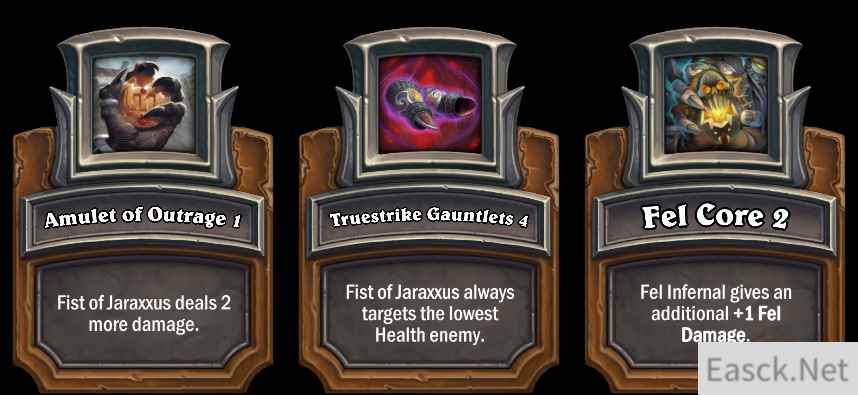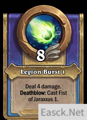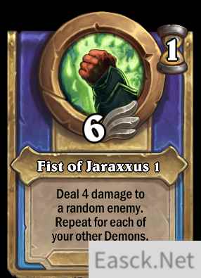 技能2:加拉克苏斯之拳(邪能) (1级)随机对一个敌人造成4点伤害。你的队伍中每有一个其他恶魔,就重复一次。 (2级)随机对一个敌人造成7点伤害。你的队伍中每有一个其他恶魔,就重复一次。 (3级)随机对一个敌人造成10点伤害。你的队伍中每有一个其他恶魔,就重复一次。 (4级)随机对一个敌人造成11点伤害。你的队伍中每有一个其他恶魔,就重复一次。 (5级)随机对一个敌人造成12点伤害。你的队伍中每有一个其他恶魔,就重复一次。
