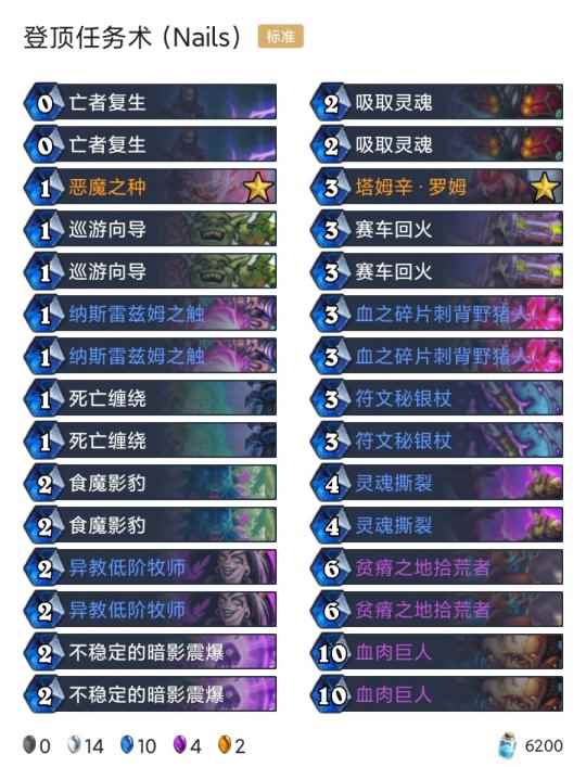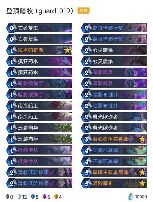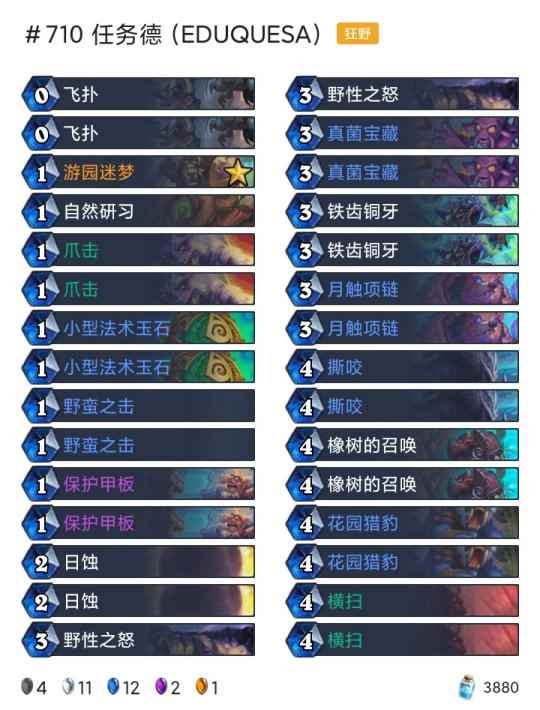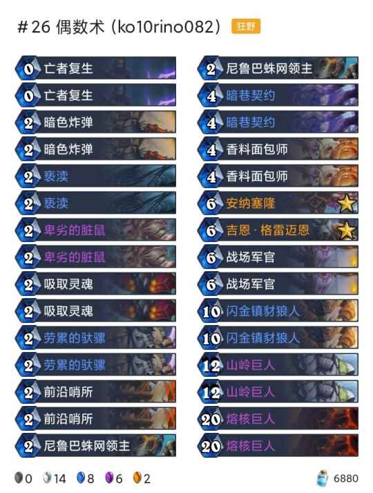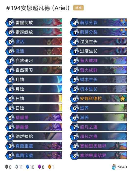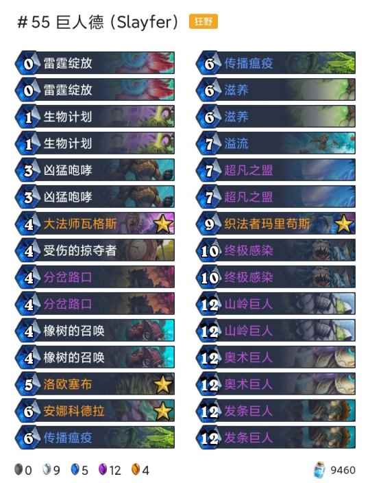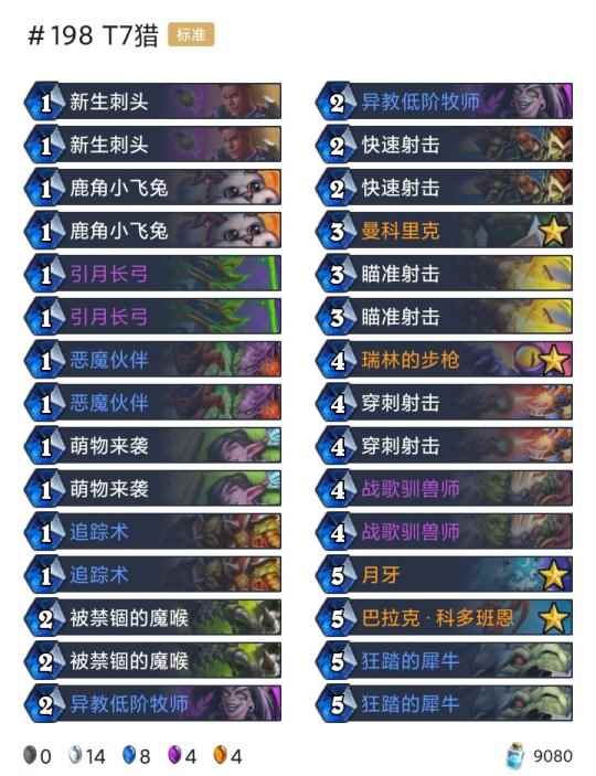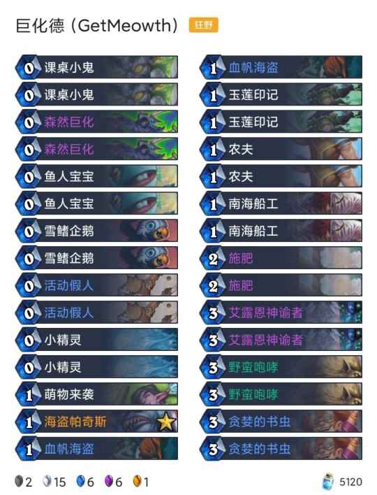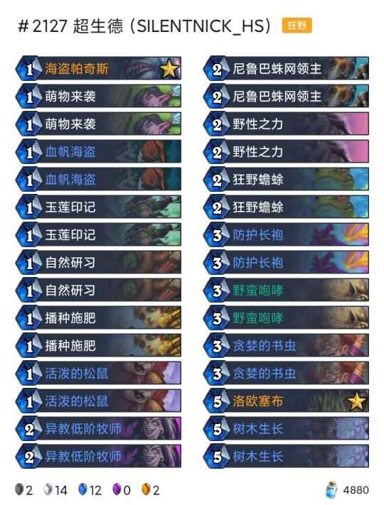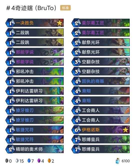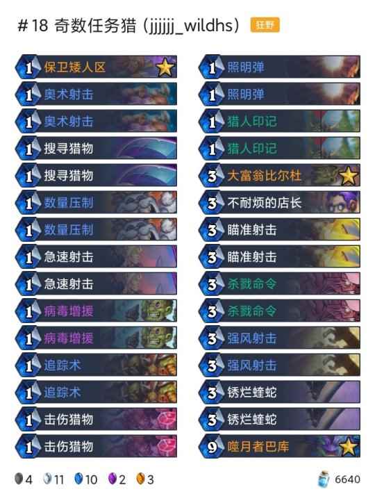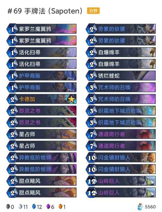 -卡组 超生德(传说2127) 巨化德 巨人德(传说55) 偶数术(传说26) 奇数任务猎(传说18) 任务德(传说710) 暗牧(登顶) 野猪牧(传说9) 点燃法(传说42) 手牌法(传说69) 快攻贼(传说4) 任务过载萨(传说6)