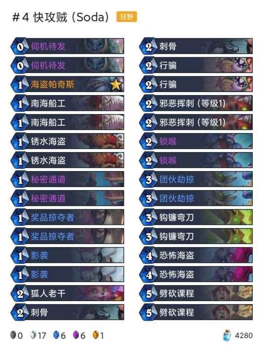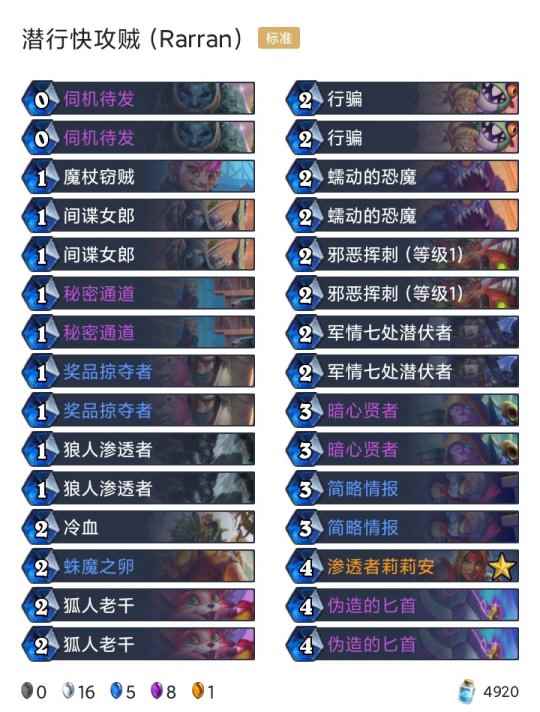 -卡组 任务术(登顶) 奇迹瞎(传说4) 安娜超凡德(传说194) T7猎(传说198) 潜行快攻贼