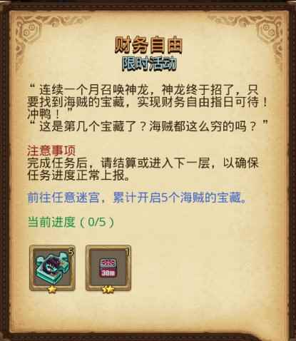 《不思议迷宫》财务自由任务完成攻略一、任务5:财务自由 前往任意迷宫,累计开启5个海贼的宝藏。 奖励:守财奴碎片x5, 伊甸js器(30m)x1 连续一个月召唤神龙,神龙终于招了,只要找到海贼的宝藏,实现财务自由指日可待!冲鸭! "这是第几个宝藏了?海贼都这么穷的吗?"