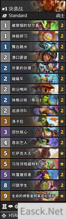 炉石传说暴风城下的集结版本已经上线,在新版本增加了很多新卡,各种卡组搭配都有所变动,而天梯更是赛马场,那么炉石传说突袭战卡组怎么玩?下面就给大家带来炉石传说突袭战卡组搭配推荐。 炉石传说突袭战卡组搭配推荐突袭战 作为上分层面不太推荐的卡组。突袭战的陨落本质上是这个版本节奏卡组的整体陨落,它的构筑没有发生本质的改动,却已经被时代无情地淘汰了。究其原因,是因为这类上个版本代表的“慢攻”卡组,是被这个版本代表的竞速卡组完美克制的。一个典型的数据就是,突袭战在几乎面对有所任务卡组时都是劣势,因为它很难在对方做完任务之前制造足够的压力,而在对方完成任务之后,再强大的生物在对方的邪能和魔法前面也不值一提了。 一般留牌:被禁锢的甘尔葛、前沿哨所、体格训练等。