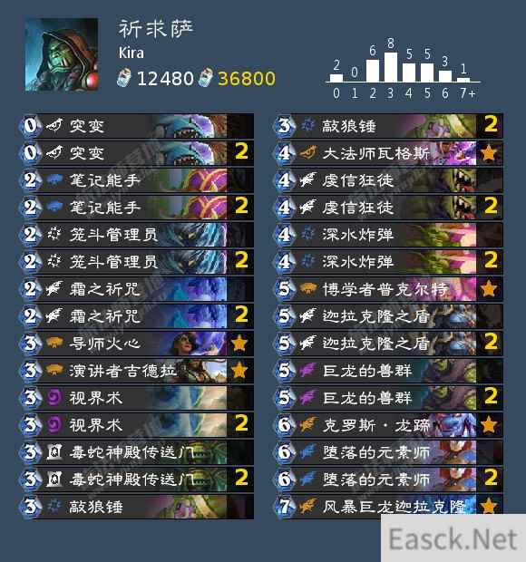 AAECAaoIBtaZA+O0A9PAA5zOA/XOA/bWAwyyBrSXA7etA7mtA/6uA6qvA9CvA9u4A+HMA6feA6reA6veAwA= 这套卡组起手留牌除了霜之祁咒和笼斗管理员外,全都可以不留去找巨龙的兽群。突变和虔信狂徒起手一起来可以考虑留下,单独来的话不考虑留。有一个值得探讨的点是起手的视界术要不要留,他个人认为视界术很少准时开,一般都要6费之后,所以他起手也不会留视界术。 这套卡组的核心是巨龙的兽魂,现在的版本能够连续处理两波巨龙的兽魂的不多。目前高分段激怒战的数量很多,而这套卡组对战士的克制作用很强,劣势对局则是超生德,换上血法师萨尔诺斯和大地崩塌也许会好一点。博学者普克尔特是卡组的核心和亮点之一,能保证这套没有过牌的萨满卡组不鬼抽,当然打出博学者普克尔特之前要算下祈求数和回合数。 总体而言,这套卡组的强度还是非常不错的,欢迎大家在天梯上多多尝试。 相关推荐:炉石传说新版本上线时间2021 |