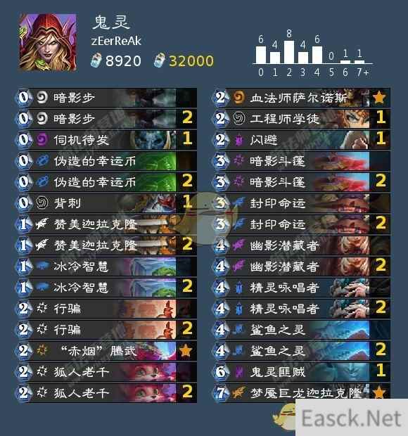 AAEBAaIHCLQBnALtBYYJ3+MCl+cCy8ADw+EDC+0C9bsC2+MCtIYDtq4Dua4Dzq8Dx84D390D4t0D590DAA== 盗贼的经典otk思路,祈求两次后通过鲨鱼之灵加幽影潜藏者配合暗影步打出大量硬币刷出牌数量,最后用双倍连击的鬼灵匪贼终结对手 个人认为鬼灵贼是盗贼所有otk卡组中强度最高的一套,虽然启动速率不如蓝龙贼,但前期出牌节奏更为顺畅,抗性更好,并不会特别怕脏鼠破坏组件,斩杀上限也更高 启动时需要保证手牌位,所以整体构筑要压低曲线,为了保证key牌检索,也要尽量减少随从密度;伺机待发值得配合的法术并不多,因此可以选择只带一张 秘密通道在这套卡组里意义并不大,消失则容易卡手,均不推荐携带 血法师萨尔诺斯和工程师学徒主要是用于前期过渡,多带一些低费随从也方便贴赞美迦拉克隆,可以替换为奖品商贩或空中私掠者之类,但并不推荐带寒光智者 曾在别处看见过携带安全检测员的构筑,但实测这张卡真的特别拉跨,不推荐带 可选卡 带一张迦拉克隆之盾来保证幽影潜藏者的触发;带一张大范来作为打快攻卡组时的planB;第二张鬼灵匪贼,提高上手率;对局中变jk的情况也不少,因此带一张克罗斯•龙蹄来控场也并非不可取 |