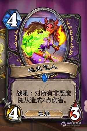 术士稀有随从,4费4/3 恶魔 战吼:对所有非恶魔随从造成2点伤害。 |
