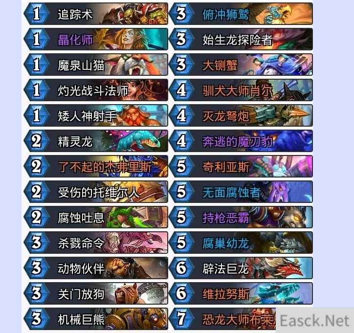 要说新版本中哪个职业的受益最大,莫过于要说是猎人了。 无论是龙猎还是宇宙猎,在天梯中都有一战之力,尤其宇宙猎更是成为了T1卡组。 而宇宙猎这套卡组进可用风暴之锤配合龙牌抢血打快攻,退又可利用姐夫和红龙女王拼后期。 最主要的是这套卡组的卡牌大多数都来自于巨龙年的拓展包,所以等到下个版本退环境时,对猎人的冲击是最小的,想要上分的小伙伴非常建议你们合这套卡组。 |