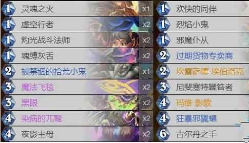 卡组构成 【1】【白】灵魂之火、【1】【白】欢快的同伴x2、【1】【白】虚空行者 【1】【白】烈焰小鬼、【1】【白】灼光战斗法师x2、【1】【白】邪魔仆从x2 【1】【白】魂缚灰舌x2、【2】【蓝】过期货物专卖商、【2】【蓝】被禁锢的拾荒小鬼 【2】【橙】坎雷萨德埃伯洛克、【3】【紫】魔法飞毯x2、【3】【白】尼斐塞特鞭者x2 【3】【紫】黑眼x2、【4】【橙】玛维影歌、【4】【紫】染病的兀鹫x2 【4】【蓝】狂暴邪翼蝠x2、【4】【白】夜影主母x2、【6】【白】古尔丹之手x2 卡组代码:AAECAf0GBs4H/aQD/acDx7kD1rkD7b4DDDDCCLWfA/ukA4GlA/muA7C2A7q2A7W5A7a5A8u5A+O+AwA= |