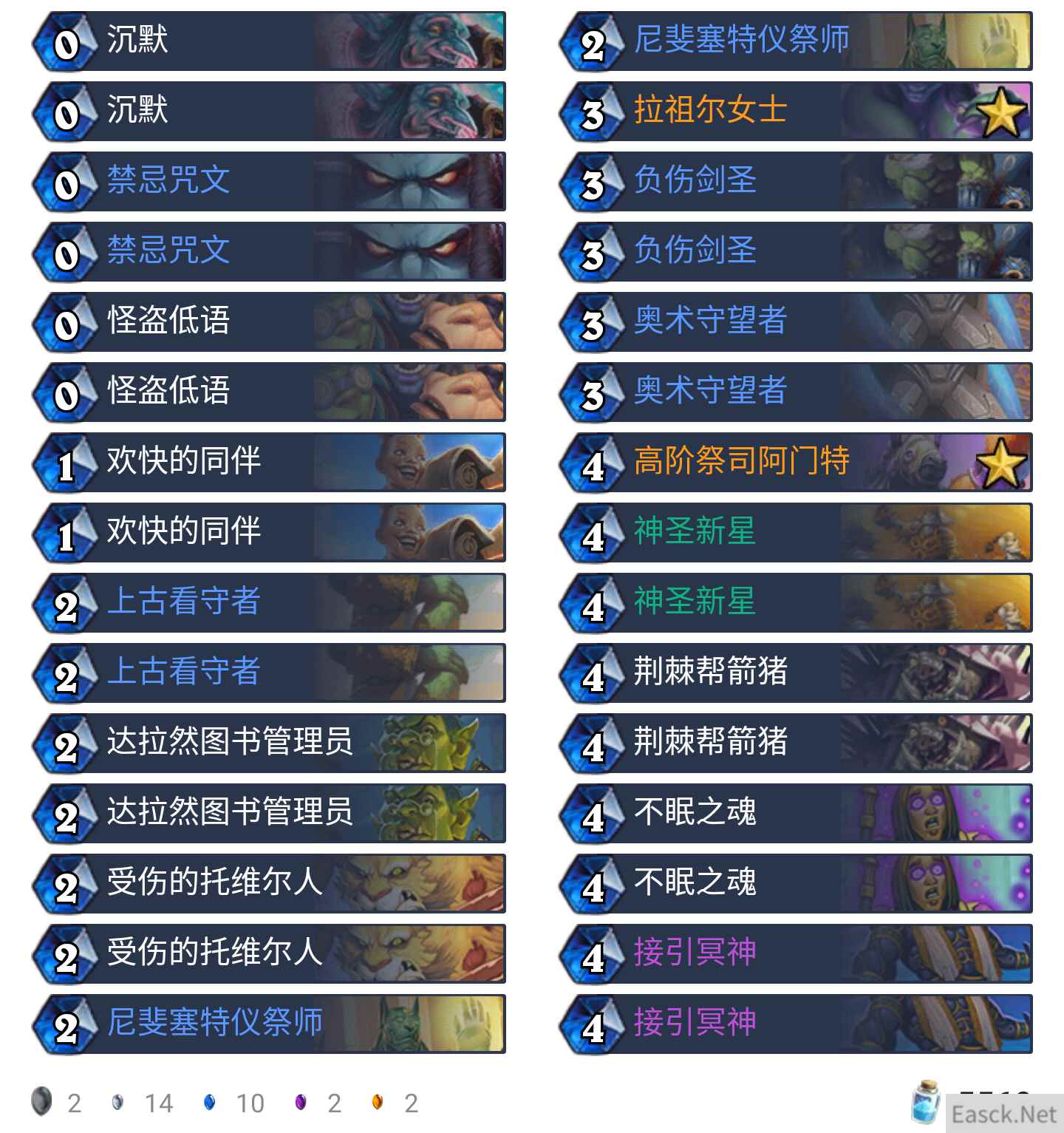 点评: 看到这套卡组我人都晕了,我这是穿越了么?2020年,你还搁这儿推荐傻子牧?还是没有心火翻倍的傻子牧!我吐啦,真就不把牧师当人。 |