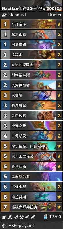 炉石传说巨龙降临传说50任务猎卡组是目前天梯非常强力的一套套牌,简单轻松就可以上分,是目前非常强力的上分套牌选择,下面就一起来看看炉石传说巨龙降临传说50任务猎卡组怎么玩,巨龙降临传说50任务猎卡组攻略。 《炉石传说》巨龙降临传说50任务猎卡组攻略 Haztlan传说50任务猎,在reddit上发的卡组,从6级打到传说前50,只用了150场