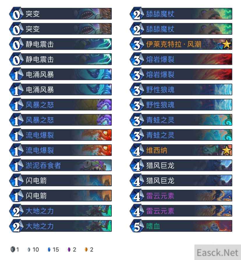 点评: den的一套打脸萨。构筑亮点是放弃了毁灭之锤与石化武器,满编了猎风雷龙和大地之力,这样改动原因是JK战很多,打JK战重要的是站场,锤子生效慢还不一定能砍动,且石化武器并不是青蛙之灵二费合格的容器,不如大地之力启动舒服。猎风雷龙当做低配477即可,主要是踢脸用的,当回合还能接个打四的静电震击,抢节奏能力拉满。 有了风暴之怒后雷云元素显得更超模了,且三费打出狼魂下回合接风暴之怒加1加1节奏也很不错。 起手留牌:电涌风暴、青蛙之灵、淤泥吞食者 |