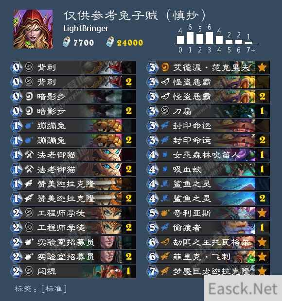 终于到了盗贼。盗贼主要有宇宙贼(大多数),福报贼(少数)和迦拉克隆贼(少数)。宇宙贼是我们的主要食粮,82开对局。五费前把所有怪能解的都解光,能贪的怪都贪,很容易抢死对面。有海盗之锚的情况下,我们的资源往往比盗贼更多。唯一怕的是一费下的怪被对面姐夫暗影步姐夫各种背刺解光毫无节奏。盗贼的奇利亚斯和634提供的微薄恢复基本可以忽略。福报贼没啥好说的,她胡了让她赢吧。加拉克隆贼与宇宙贼类似。防好中背刺,营造好场面,对面没有巨范的情况下很难赢。