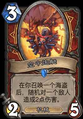 空中炮艇这张牌,就是肉眼可见的船载火炮重制版。325身材硬朗,不怕中背刺(封印命运),不怕544突袭,配合众多海盗可以打出解场加站场加打脸的效果(让它打脸它解怪,让它解怪它打脸)。可以说也是对于海盗战非常重要的补强了。作为这套牌唯一的一张三费生物,它几乎是起手必留牌。