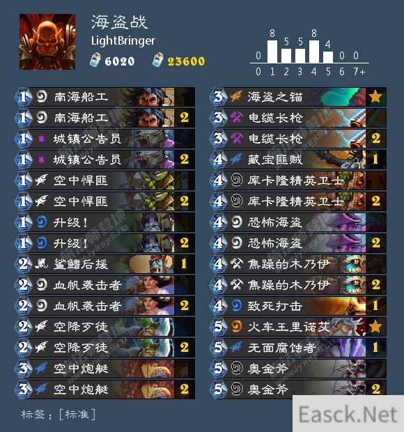炉石传说在2020年里将会带来很多强力战士卡组,比如海盗战。由于补丁发布,新版海盗战玩法有着较大的区别。那么2020年海盗战怎么玩?卡组配什么好?下面就为大家带来炉石传说2020海盗战天梯攻略。 2020海盗战卡组 由于补丁前我就曾使用海盗战(被萨满吊打),这也就导致对阵萨满的胜率偏低。据我估计,这套牌的实际胜率大约在70%左右,非常适合用来上分。大家也可以看到,之所以称这套牌是针对环境的套牌,是因为环境中大量的猎人、盗贼和战士都基本是我们的优势对局,所以这套牌的上分效率相当高。废话不多说,下面上卡组!