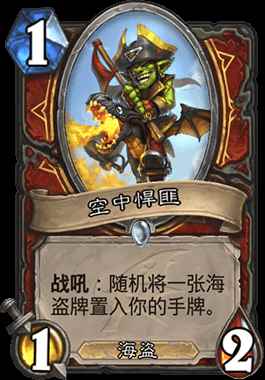 空中悍匪——强无敌。112扎实的身材,强大的战吼效果,补牌手段。空中悍匪的强度在海盗战中得到了充分体现。同时,这也是一张有梦想的卡牌。第一,如果给出荆棘帮蟊贼可以找法术寻求翻盘的希望;第二,如果给出钩牙船长,可以瞬间出3个突袭海盗,完成战场解场加过牌;第三,可以回响。当然,一些其他海盗也往往有各自的作用,这里就不多加赘述。小TIPS:空中悍匪给空降歹徒,歹徒不会立刻落下。