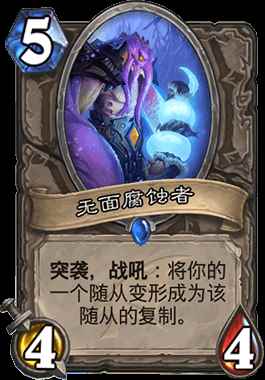 无面腐蚀者,被削弱的王者,然而事实是他依旧很强。两个44突袭仍然能够让盗贼焦头烂额,难以解场。使用这张牌的要点就是手中尽量留下一费的跟班或者海盗或者公告员防止场面被解光无法变形。 对局分析 首先是所有对局,起手找三费刀任意一把都行。推荐将奥金斧和升级换去。基本所有对局都可以留112海盗和公告员。南海船工必换,四费以上曲线必换。空降歹徒如果有112海盗或者鲨鳍后援可以留,其余情况必换。223海盗没有一费怪可以留。 特别注意:我们的思路是,武器解场,生物走脸!尽量解场,不要随便走脸。 这非常重要。解场对于海盗战非常重要。因为海盗战的纯直伤往往是打不死对面的,在没有生物的帮助下,你几乎无法处理任何墙(尤其是奇利亚斯)。现在天梯我们主要的上分食粮盗贼,猎人和战士,他们的共同特点就是解场能力差。没有刀扇的盗贼很怕残血生物,几个掉成1血的生物能要了她的老命。猎人只认脸,除非连抽爆炸不然几乎没有解场。迦拉克隆战要么解不了,要么就要卖脸。所以我们发现,只有生物踢脸才是胜利的关键,能保的随从尽量要保!尤其是五费防无面腐蚀者,一定要解场。