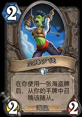 第二张海盗战明星单卡自然是这张空降歹徒。作为一名空降兵,她不是被从牌库大炮里射出来的,而是从手牌中跳出来的!可以说,这张牌非常有空降的感觉。222身材裸下不算太亏,关键其实是配合其他海盗达到022的效果,非常IMBA。当然,这种让场面瞬间膨胀的牌往往会导致手牌的缺失,但是由于海盗之锚、空中悍匪和电缆长枪的加入,海盗战手牌缺失的问题得到了缓解。那么这张牌就显得更加厉害了。下面我们来聊聊上文提到的空中悍匪。