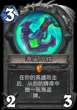 首先肯定是我们的明星(核心)新卡海盗之锚啦!这是暴雪爸爸给海盗战补强最大的一张卡,有了它,再也不用担心手上没有资源只能打脸等神抽了,有了它,海盗战终于有了绝佳的续航可以打出质量了!可以说,这张牌是盘活了海盗战的灵魂,不得不带!