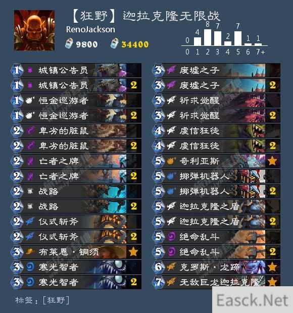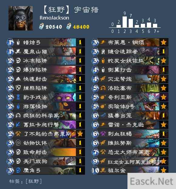 AAEBAaPLAwSFF6CAA+O0A8XAAw1L+AffxAKOzgKd8AKb8wKe+wKz/ALYrQParQP+rgOqrwPSrwMA 外服玩家RenoJackson从100打到第七的两套卡组,第一套宇宙猎打出了23-14的战绩,第二套JK无限战8-4。 这套宇宙猎选择携带了奥秘体系来平稳度过前期,为了更好的配合奥秘选择带了祖尔金。带上维拉努斯和灭龙弩炮两张猎人新橙纯粹是因为超模。这套宇宙猎的前期作战能力不弱,而一旦到了中后期,恐龙大师布莱恩、红龙女王阿莱克丝塔萨、洛欧塞布等优质牌能源源不断的给对手施压。是一套娱乐性十足,同时具有一定强度的卡组。 这套JK战舍弃了常见的龙体系和海盗体系,而是选择亡者之牌+前期过渡牌打无限体系。这套战士走的是控制反击的思路,战士祈求后的英雄+3攻可以在前期解场。到了中后期,可以用铜须+爆牌鱼爆牌,或是铜须+脏鼠拉的方式破坏对手otk组件来获胜,也有双亡者之牌能打无限牌库,有狗贼嘘嘘那味了!另外在前期场面控住后,就可以考虑吹响反击的号角,除了用JK战吼抽上来的随从给压力外,还可以通过不断祈求来给对手造成血线压力,再伺机终结对手。总体来说我觉得这套牌的构筑思路值得借鉴,缺点就是不能带尤格·萨隆,又没有嘘嘘那味了!喜欢无限战的玩家可以试下这套卡组。