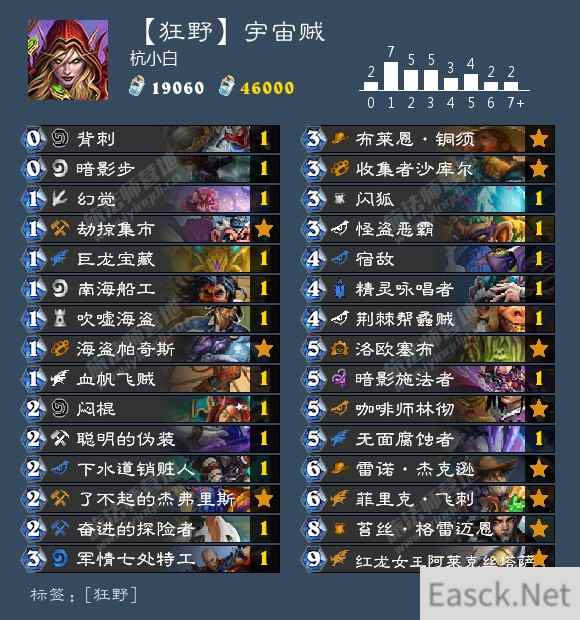 AAEBAaIHHrQB7QLNA9QF3Qj6DsMWhRfcrwKStgKRvALJvwKbyALb4wLr8ALH+AKPlwOQlwO9mQP7mgP+mgP8owO7pQOnqAOtqAO3rgO/rgPBrgOCsQORsQMAAA== 杭小白的一套剽窃体系的宇宙贼,他在传说1000左右分段划水。 作为一套27+3的构筑,宇宙贼的卡位比较灵活,可以自由更换。杭小白的宇宙贼选择带上了奥丹姆任务劫掠集市和剽窃体系,在狂野的环境下想完成4张剽窃任务易如反掌,而任务的奖励无论是补刀还是解船载火炮等威胁性大的三血生物上都非常好用。由于任务奖励是英雄技能,因此并没有带贼dk。此外宇宙卡组并非只有控制这一条出路,这套宇宙贼的构筑曲线更趋向于前期,舍弃了学术剽窃等大后期牌,所以到了游戏的中期,要尽快利用洛欧塞布、红龙等牌压制并终结对手。