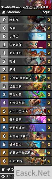 炉石传说巨龙降临标准模式下亡语贼怎么玩?亡语贼作为当前版本热门的卡组,成为很多小伙伴上分的首选之一,这里给大家带来巨龙降临登顶战亡语贼卡组推荐。 TheMadBanana登顶亡语贼,相对于萨满的强势,我个人认为盗贼的潜力更多,只不过潜力释放得缓慢一些而已,今天就有各种形态的4组盗贼卡组 这套根据昨天deaddraw登顶亡语贼在进行改良,由TheMadBanana在美服登顶,目前仍然在美服榜首